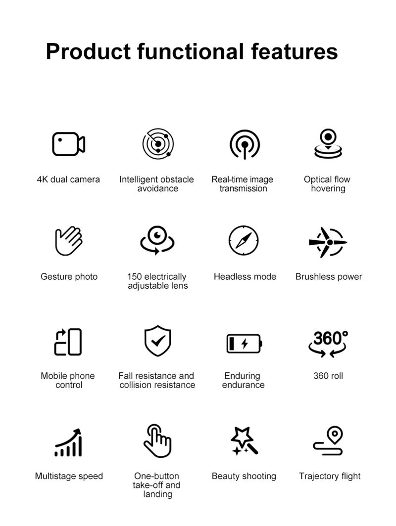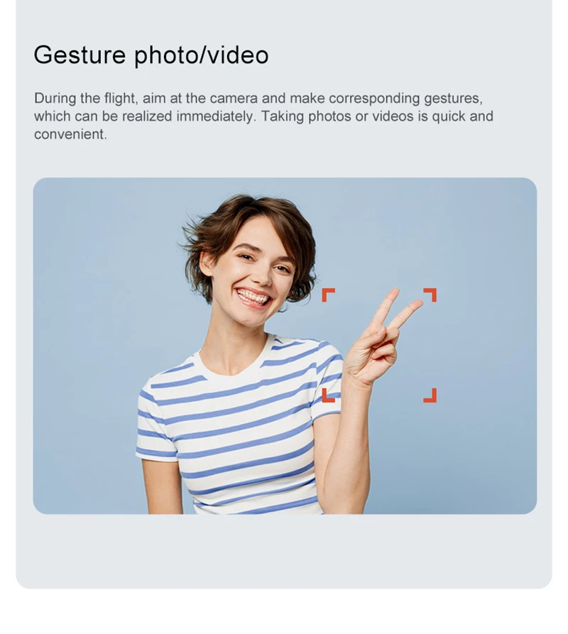 APP FunctionsGesture photography, video recording, headless mode, emergency stop, trajectory flight, gravity sensing, music, 50x zoom, automatic photography